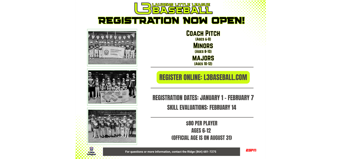 New this season - Laurens Little League is collaborating with Sports Connect. All communication will be shown online and you must register ONLINE.